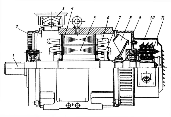 1— вал; 2, 10 — подшипниковые щиты; 3 — контактные кольца; 4 — корпус; 5 — коробка выдов;