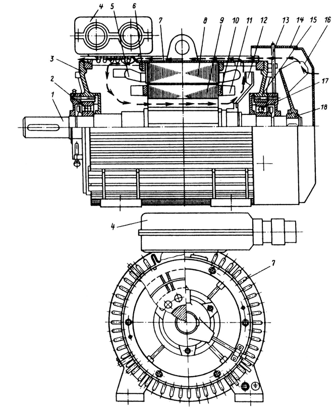 1 — вал; 2, 17 — подшипники; 3. 15 — подшипниковые щиты; 4 — коробка выводов;