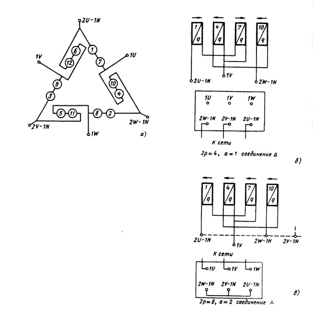 На рис. 3.37 показаны условные схемы включения двухскоростного асинхронного двигателя на 2р = 4/8, рассчитанного на работу с одной и той же мощностью при 2р = 4 и 2р = 8. На высшей частоте вращения (2р = 4) его обмотку соединяют в треугольник при а = 1, а на низшей (2р = 8) — в звезду при а = 2. При том и при другом числе полюсов катушки обмотки остаются теми же самыми, поэтому их выполняют с шагом, равным или несколько большим полюсного деления при большем числе полюсов.