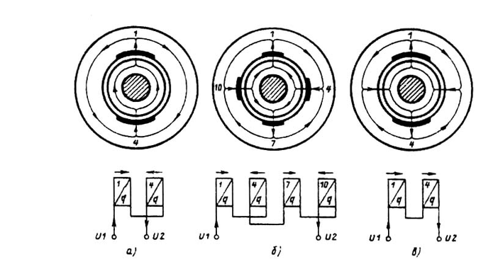 Рис. 3.34. Катушечные группы одно-двухслойной