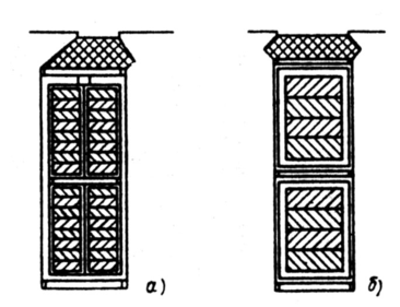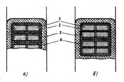 В катушках, намотанных из двух элементарных проводников, они располагаются рядом на одной высоте (рис. 3.7, а), чтобы их индуктивное сопротивление было одинаково. Взаимное расположение четырех элементарных проводников показано на рис. 3.7, б.