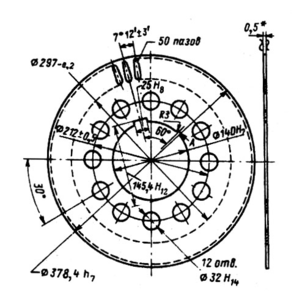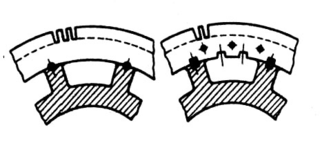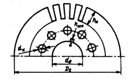 Магнитопроводы роторов асинхронных двигателей и Якорей машин постоянного тока с внешним диаметром менее 990 мм собирают из целых листов, которые вырубаются из электротехнической стали толщиной 0,5 мм (рис. 8.45). В листе штампуют пазы, а при необходимости, кроме того, круглые отверстия диаметр 15…35 мм для образования вентиляционных каналов. При большой радиальной высоте листа отверстия располагают в несколько концентрических рядов в шахматном порядке. Для посадки магнитопровода на вал в центре ли штампуются отверстие, в котором предусматривается шпоночная канавка, а также круглая лунка — шихтовочный знак А, для того чтобы при шихтовке укладывать все листы в одно и то же положение относительно друг друга. В результате такой укладки пазы получаются с более ровными стенками. После штамповки и снятия заусенцев листы лакируют и подвергают термообработке для создания оксидной пленки. При изготовлении роторов асинхронных двигателей с литой клеткой магнитопроводы сначала собирают из листов на оправке, а после заливки алюминиевой обмотки напрессовывают на вал. При внешних диаметрах ротора до 200...300 мм магнитопроводы сажают на гладкий вал горячей посадкой, а при больших диаметрах на валу предусматривается шпонка.