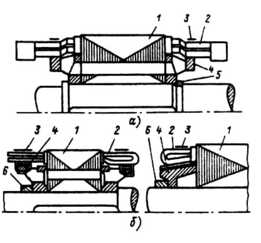 Магнитопровод ротора или якоря в спрессованном состоянии фиксируется на валу в осевом направлении или с помощью пружинит колец 5, врезанных в канавку на валу, или втулок 6, насаживаемых на вал с большим натягом. Иногда для фиксации магнитопровода с одной стороны упирается в предусмотренный на валу буртик. Лобовые части обмотки закрепляют бандажом 3.