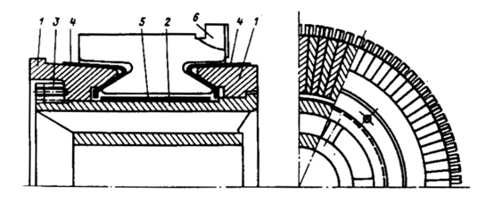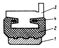 В коллекторах относительно небольших размеров (с внешним диаметром до 40...50 см) в настоящее время находит широкое применение крепление пластин пластмассами (рис. 8.56). По сравнению с креплением нажимными фланцами такие коллекторы более надежны в эксплуатации в отношении сохранения правильной цилиндрической формы, имеют меньшую трудоемкость изготовления и себестоимость за счет отсутствия механической обработки пластин на станке. Для посадки коллектора на вал внутри его предусматривают стальную втулку 1, в которой для лучшего сцепления с пластмассой проточены кольцевые канавки. Пластмассу 2 впрессовывают в пространство между втулкой и коллекторными пластинами. Для этого применяют пластмассу марки К6 или АГ-4. В целях повышения механической прочности в углубления коллекторных пластин 3 вкладывают армировочные кольца 4, выполненные из стальной проволоки или полосы. Размеры колец и число их витков зависят от диаметра коллектора. Показанная на рис. 8.5 конструкция коллектора применяется при их диаметрах до 25 см.