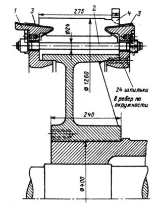 Пример конструкции коллекторов с большими диаметрами показан на рис. 8.55. Здесь нажимные фланцы 1 стягивают стальными шпильками 2. На фланцы надевают миканитовые манжеты 3. При большой разнице в диаметрах якоря и коллектора в шлиц пластины впаивают медные полоски 4 — петушки, к которым присоединяют проводники якоря.