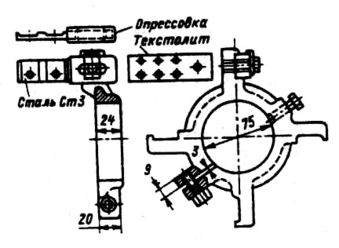 В машинах постоянного тока щеточные пальцы крепят к траверсе, являющейся несущей конструкцией всего узла токосъема. Траверса должна иметь возможность перемещения по окружности в целях установки щеток на геометрическую нейтраль при сборке и наладке машины. На рис. 8.64 показана одна из возможных конструкций траверсы, которая применяется для машин относительно небольших мощностей. Траверсу закрепляют на специальной заточке подшипникового щита стяжными и стопорными болтами.