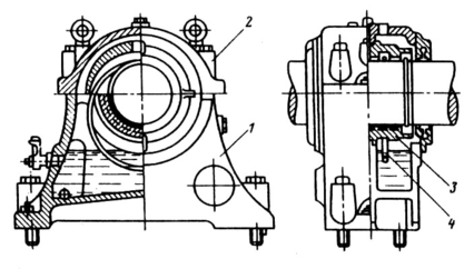 Подшипники скольжения. В настоящее время подшипники скольжения применяют главным образом для крупных электрических машин и выполняют в виде стояковых подшипников (рис. 8.23). Корпус подшипника изготовляется из чугуна. В корпус входят стояк 1 и верхняя крышка 2. Основным элементом подшипника являете вкладыш 3 — втулка, разрезанная по образующей на две половины. В его верхней половине выполняют одно или два отверстия для смазочных колец 4. Вкладыши изготовляются из стали, чугуна, бронзы и других материалов. Толщина вкладышей принимаете равной