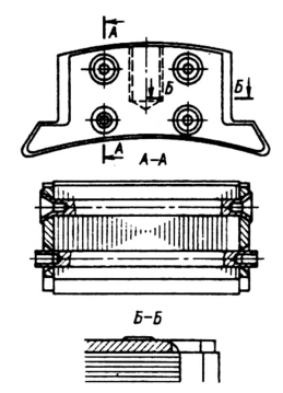Они равномерно распределяются по поверхности листов и занимают около 0,02—0,03 этой поверхности. Обычно их не менее четырех. Диаметры отверстий под клепки принимаются на 0,15...0,2 мм больше диаметра самой заклепки. Для полюсов применяются заклепки диаметром 6, 8, 10 и 12 мм.