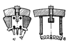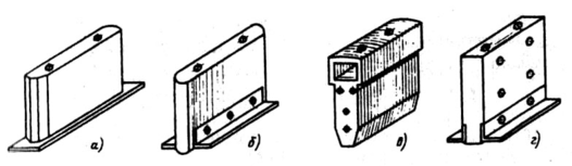 Добавочные полюсы выполняются цельными или собранными из штампованных стальных листов. В машинах относительно небольшой мощности добавочные полюсы выполняются в виде стальных отливок или из полос проката. В настоящее время они часто собираются из листовой стали толщиной 1 мм. На рис. 8.27 даны различные исполнения добавочных полюсов. Сердечник полюса и его наконечник (рис. 8.27, а) выполняются из одной заготовки путем ее последующей обработки. Полочки (рис. 8.27, б и г), служащие для поддержания катушек, выполняются из немагнитных материалов и прикрепляются заклепками к телу полюса. В машинах относительно большой мощности полюсы выполняются Т-образной формы (рис. 8.27, в), при таком их выполнении увеличивается поверхность прилегания полюса к станине и уменьшается индукция в стыке. Полюсы, собранные из отдельных листов, имеют преимущество перед массивными, так как в них уменьшается действие вихревых токов при переходных процессах, что способствует улучшению коммутации.