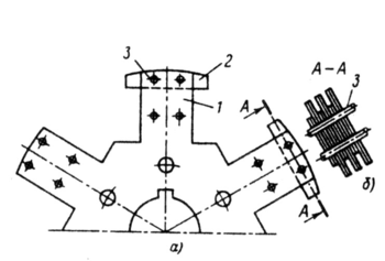 Сердечник ротора 5 собирают из листов электротехнической стали, которые имеют форму звезды с числом лучей (выступов) 1, равным числу полюсов (рис. 10.7, а). Листы используют двух видов, отличающих друг от друга высотой выступов. Из той же стали, штампуют сегменты 2, имеющие форму полюсных наконечников. По длине сердечник состоит из чередующих пакетов, состоящих из листов с короткими или длинными выступами. Крайние пакеты с короткими выступами собранны из листов тонколистовой стали толщиной 2 мм.