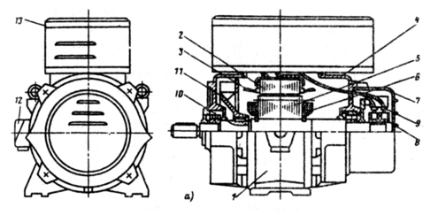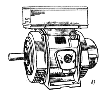 На рис. 10.6, а дана конструкция синхронного генератора серии ЕСС, а на рис. 10.6, б — его внешний вид. Генераторы изготовляют в горизонтальном защищенном исполнении. По способу крепления и конструкции подшипниковых узлов генераторы имеют две формы исполнения: IM1001 (на лапах с двумя одинаковыми подшипниковыми щитами) и IM2101 (на лапах с фланцевым подшипниковым щитом со стороны вала). Станина генератора 1 — чугунная, литая. В верхней ее части имеется проем прямоугольной формы, над которым устанавливают блок регулирования напряжения 13. На внутренней поверхности станины равномерно по окружности расположены продольные ребра, на которые сажают обмотанный магнитопровод статора. Каналы, образованные между ребрами и наружной поверхностью статорного магнитопровода, служат для прохождения охлаждающего воздуха. Вентиляция генератора — аксиальная, вытяжная. Воздух забирается центробежным вентилятором 11 через отверстия в щите, расположенном со стороны контактных колец. Подшипниковые щиты 4 — чугунные, литые. В нижних частях щитов расположены окна для прохождения воздуха. Окна защищены сетками, штампованными из листовой стали. Для увеличения размеров окон нижняя часть щитов расширена.