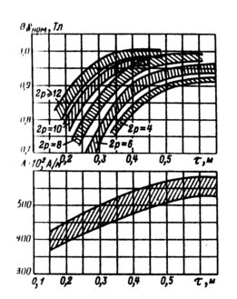 можно так же выбирать по кривым рис. 10.9, а линейную нагрузку целесообразно снизить на 10…15%, так как из-за более толстой пазовой изоляции ухудшается охлаждение проводников обмотки якоря.
