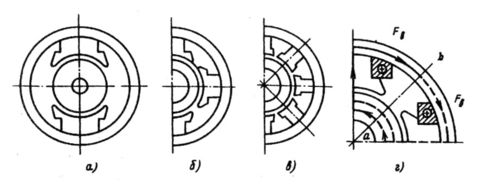 Рис. 11.22. Магнитные системы (а—в) и магнитная цепь (г) машин постоянного тока