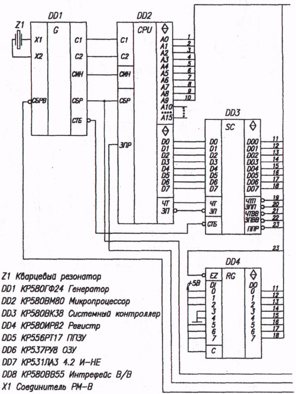 БИС ГФ24 - генератор, ВМ80 - микропроцессор, ВК38 - системный контроллер образуют процессор управляющей системы. Реальные возможности такого процессора шире требуемых для выполнения задания, поэтому есть неиспользуемые выводы этих БИС. Они на схеме не указаны.