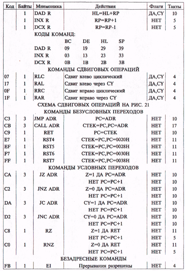 | Код | Байты | Мнемоника | Действия | Флаги | Такты |