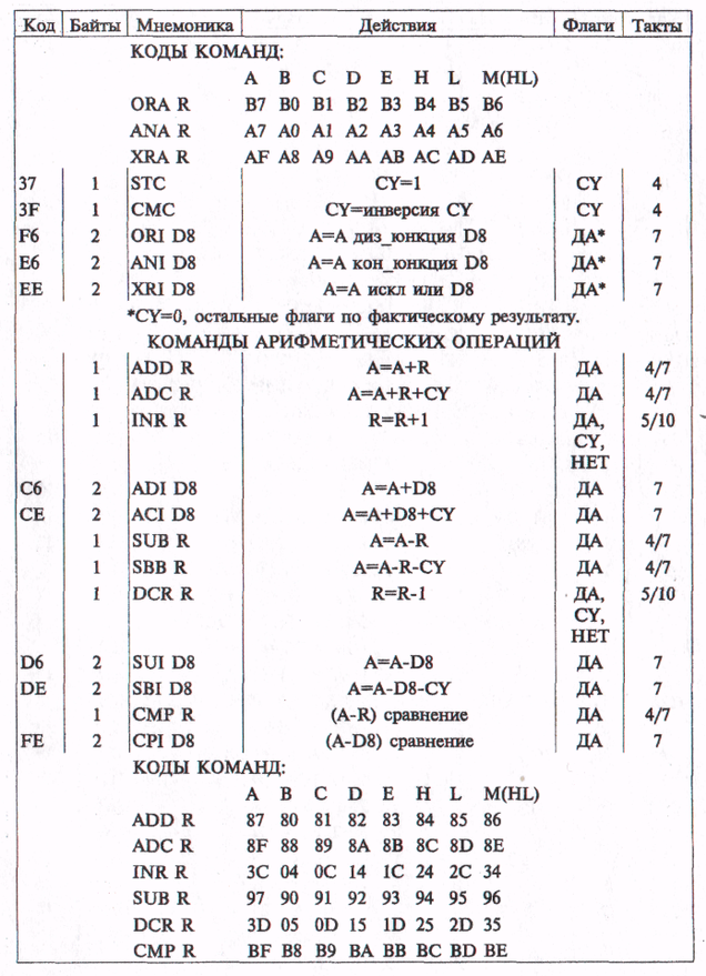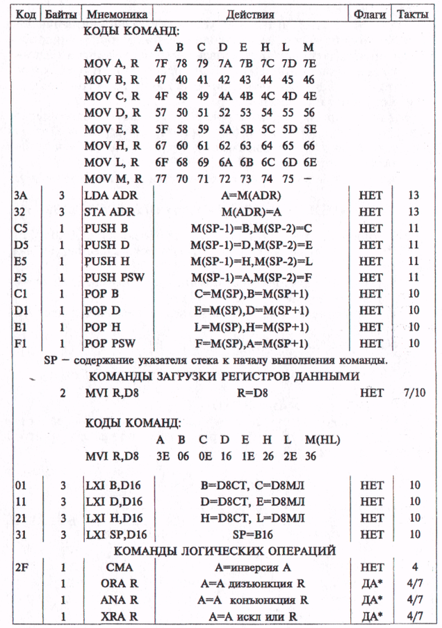 | F3 00 76 | 1 1 1 | DI NOP HLT | Прерывания запрещены Нет операции, PC=PC+1 Останов | НЕТ НЕТ НЕТ | 4 4 4 |