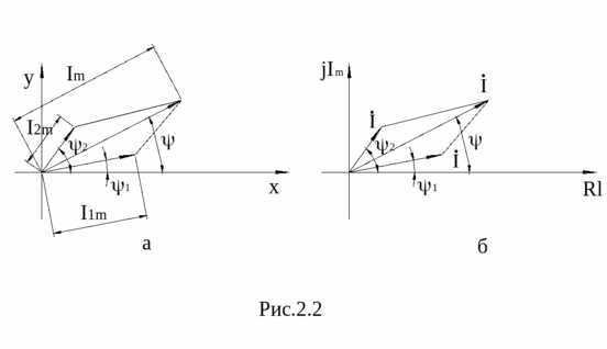 Тригонометрическому уравнению (1) можно дать геометрическую интерпретацию, если каждому синусоидальному значению поставить в соответствие вектор на плоскости в координатах x, y, рис. 2.2а. Длиной вектора будет амплитуда тока, а фазой – начальная фаза синусоиды