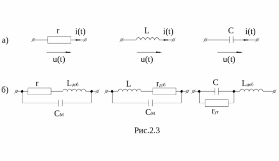 для конденсаторов, рис. 2.3б. В проволочных сопротивлениях и катушках индуктивности учитывают также межвитковую емкость