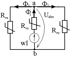 При решении задачи удобнее использовать схему замещения (рис. 1.15) магнитной цепи (рис. 1.14), подобную схеме нелинейной электрической цепи постоянного тока с той разницей, что ЭДС заменена на МДС w×I, токи в ветвях электрической цепи – потоками Ф1, Ф2 , Ф3 в ветвях магнитной цепи, нелинейные сопротивления R(I) – магнитными сопротивлениями RM(Ф).