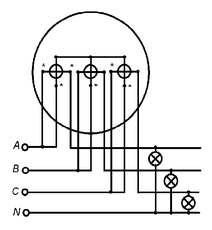 В трехфазных цепях активную энергию Wа, измеряют трех- или четырехэлементными трехфазными счетчиками. Трехэлементные счетчики конструктивно представляют собой три измерительные системы однофазных счетчиков, имеющих общую ось. Трехэлементные счетчики (рис. 7.11, а) используют в четырехпроводных цепях трехфазного тока.