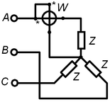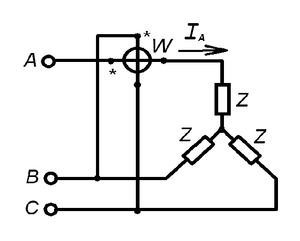 этой схеме токовая обмотка включена в линейный провод А, а параллельная обмотка напряжения — на линейное напряжение UВС.