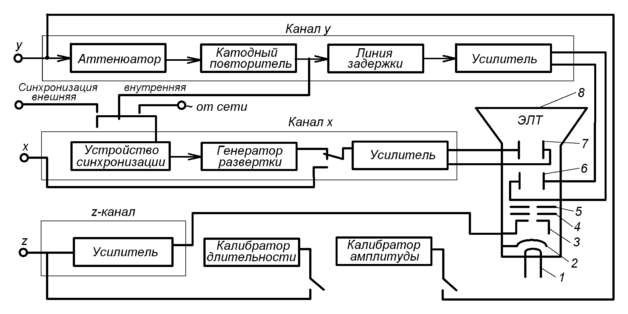 Основным узлом осциллографа является вакуумная электронно-лучевая трубка ЭЛТ, которая преобразует электрические сигналы в световое изображение. Катод 2, подогреваемый нитью накала 1, является источником свободных электронов, которые формируются в электронный луч и фокусируются первым анодом 4 на экране 8 ЭЛТ. Ускорение электронов луча осуществляется вторым анодом 5. При соударении электронов с экраном 8 их кинетическая энергия преобразуется в световое излучение посредством катодолюминофоров, т. е. веществ, светящихся под действием бомбардировки их электронами. Время послесвечения (после прекращения действия электронного луча) может составлять от 0,05 до 20 с и более.
