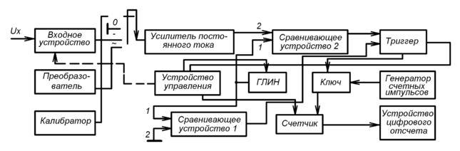 Рассмотрим работу ЦИП на примере электронного цифрового вольтметра с время-импульсным преобразованием, при котором измеряемое напряжение Ux, вначале преобразуется во временной интервал, а затем в цифровой вид. Функциональная схема данного вольтметра представлена на рис. 7.15. Основными узлами цифрового вольтметра, которые осуществляют связь измеряемого напряжения с временным