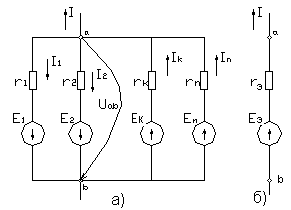 При наличии n ветвей между точками a и b применение метода узловых напряжений позволяет ограничиться составлением и решением одного уравнения для определения напряжения Uab между узлами a и b. Задавшись положительным направлением напряжения Uab (см. рис.1.25) и учитывая направления э.д.с в ветвях в соответствии с изложенным выше , получим формулу для определения напряжения Uab: