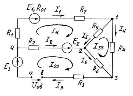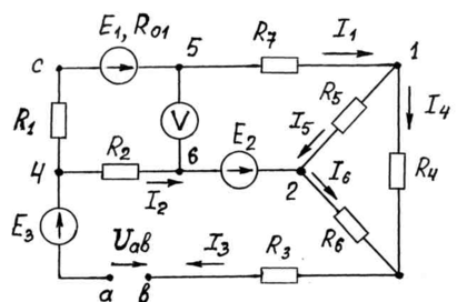 Уравнения (1) и (4) составляют полную систему уравнений, составленных по законам Кирхгофа для заданной схемы. Подставив в нее известные числовые значения сопротивлений, ЭДС и напряжения Uab , необходимо, используя компьютер, определить все токи в схеме.