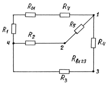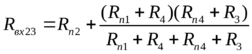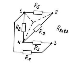 При переходе от схемы рис.7 к схеме рис. 8 проведено преобразование треугольника сопротивлений R5, R2, R8 (здесь R8=R1+R01+R7) в эквивалентную звезду с сопротивлениями Rn1, Rn2, Rn4, которые вычисляются по формулам: