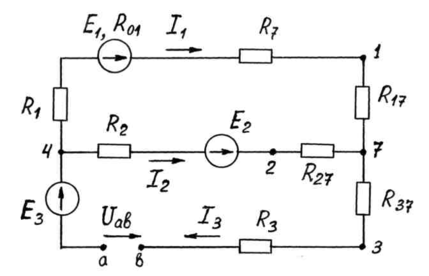 В этом выражении, если напряжение U74 , приложенное к рассматриваемой ветви , и ЭДС совпадают с направлением тока в ветви, то берутся со знаком плюс. Эти токи I1, I2, I3 одинаковые в преобразованной и исходной схемах.