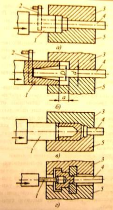 | Операции при штамповке ГКМ: высадка (рис.а), пробивка(рис г) Штампы ГКМ: 1 – пуансон 2 – упор (задает положение прутка) 3 – неподвижная матрица 4 – пруток с нагретым на конце участком (хвостовик) 5 – подвижная матрица (приводится в движение |