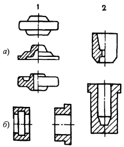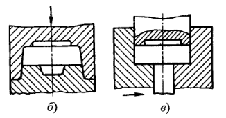 Штамповка в закрытых штампах характеризуется тем, что полость штампа в процессе деформирования остается закрытой. Зазор между подвижной и неподвижной частями штампа при этом постоянный и небольшой, так что образование облоя в нем не предусмотрено. Устройство таких штампов зависит от типа машины, на которой штампуют. Например, нижняя половина штампа может иметь полость, а верхняя – выступ (на прессах), или наоборот (на молотах). Закрытый штамп может иметь не одну, а две взаимно перпендикулярные плоскости разъема, т.е. состоять из трех частей. Как правило штамповкой в закрытых штампах получают поковки групп 1 и 2. Существенное преимущество штамповки в закрытых штампах – уменьшение расхода металла поскольку нет отхода в облой.