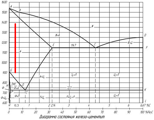 На диаграмме состояния Fe-C укажите температурный интервал нагрева для обработки давлением заготовки, изготовленной из стали 3.