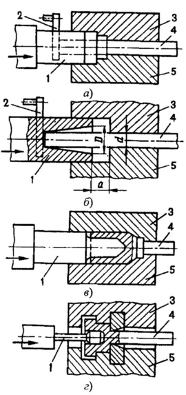 Схемы основных операций при штамповке на ГКМ: а – высадка, б – высадка-набор металла, в – прошивка, г – пробивка. (рисунок см. ниже)