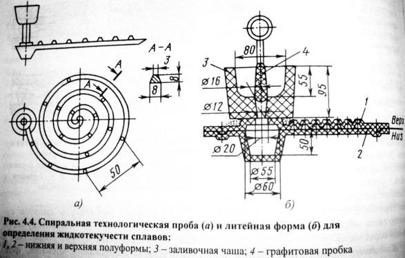 Жидкотекучесть – способность сплава заполнять литейную форму. Определяется спец. литейной формой. Расплавленный металл заливают в литниковую чашу, отверстие которой закрыто графитовой пробкой. После подъёма пробки металл плавно заполняет спираль. За меру жидкотекучести принимают длину заполненной части спирали, измеряемую в мм.