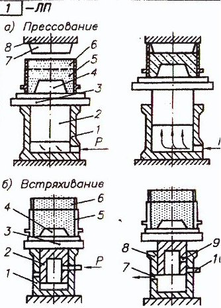 1- цил. формовочной машины 2- пресс-поршень 3- стол 4-модельная плита 5-опока с формовочной смесью, 6-наполнительная рамка 7-прессов. колодка, 8-траверсы форм машины