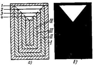 В начале затвердевания образуется контурная корка I (рис. 3, а). В связи с тем, что объем возникшей твердой фазы меньше объема жидкости, затраченной на образование корки, уровень жидкости внутри слитка понижается до горизонтали 1. В следующий период времени затвердевает слой II, причем усадка, происходящая при кристаллизации, компенсируется понижением зеркала жидкости до уровня 2. В дальнейшем при затвердевании слоев III и IV уровень жидкости понижается соответственно до горизонталей 3 и 4.