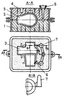 1-металлический сердечник; 2-плавильный канал; 3-первичная обмотка; 4-огнеупорная футеровка. В качестве шихтовых материалов прим. чистую медь, отходы производства, цинк, олово, железо, никель и др. Для предохран. от окисл. и поглощения водорода плавку меди ведут под слоем древесного угля. Нагретый до темп. 1200 °С расплав раскисляют фосфористой бронзой, затем вводят лигатуры или чистые металлы для получения треб. хим. состава. | Отливки из медных сплавов(~80%) изгот. литьем в песчаные и оболочковые формы а так же литьем в кокиль, под давлением, центробежным литьем и др. Схема литейной формы для отливки корпуса из медных сплавов: 1,2-нижня и верхняя полуформы; 3-стержень; 4-открытая прибыль; 5-литниковая воронка; 6-холодильник; 7-закрытая прибыль. Устанавливают прибыли и холодильники для предупрежд. обр. усадочных раковин и пористости в массивных узлах отливок. Для предупр. появл. трещин в отливках исп. форму с высок. податливостью. Для увелич. податливости в формовочную смесь вводят опилки. |