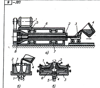 1- электродвигатель/2- изложница/3 – желоб /4 –ковш/5 – ролики/ 6 – корпус/ 7 – опорные ролики/ 8-песчаный стержень