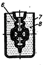 | Сборка и центрирование полуформ. Толщина стенки формы 5-20 мм. 7- опока (контейнер). 8 – опорный м-л (песок или чугунная дробь) Потом производится заливка. |