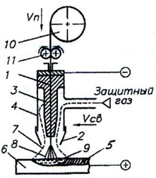 дуга горит между основным металлом и металлическим стержнем, подаваемым в зону сварки по мере плавления.