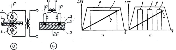 Листовые заготовки 1 собирают внахлестку, зажимают между электродами 2 и пропускают ток. При движении роликов по заготовкам образуется перекрывающие друг друга сварные токи, в результате чего получается сплошной герметичный шов. Шовную сварку можно выполнить при двухстороннем (а) и односторонним (б) расположением электродов. Сварку по циклограмме с непрерывным включением тока (а) применяют для коротких швов и сварки металлов и сплавов, не склонных к росту зерна и не претерпевающих заметных структурных превращений при перегреве околошовной зоны (низкоуглеродистые и низколегированные стали). Циклограмма с прерывистым включением тока (б) обеспечивает стабильность процесса и высокое качество сварного сеединения при малой зоне термического влияния. Ее используют при сварке длинных швов на заготовках из высоколегированных сталей и алюминиевых сплавов.