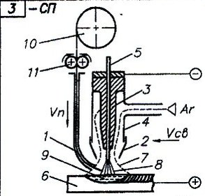 Ток порядка 100-150 А. Подача проволоки автоматизирована. Отличие от ручной сварки – электрод не покрыт флюсом.