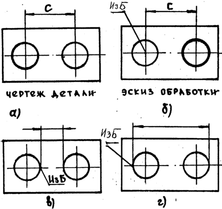 Определение 2. Исходная база (ИБ) - поверхность, линия или точка самой детали или линии и точки связанные с деталью, относительно которых на операционном эскизе координировано положение обрабатываемой поверхности детали исходным размером. Примеры исходных баз показаны на рис.3. Так как исходная и технологическая базы определяются только в направлении исходного размера и для каждого из этих размеров должны быть свои базы, то на эскизах, указывая ту или иную базу, следует рядом с обозначением базы ставить номинальное значение исходного размера, например ИБ40.
