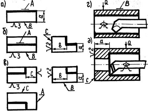 Эскиз 2 (рис.11,в). Исходный размер выбран тот же - А. Но в качестве технологической базы назначена поверхность ТБА, т.е. исходная и технологическая базы не совпадают. Это условие обозначают так ИБАТБА. В данном варианте несомненно проще и удобнее установка детали. Но на точность размера А оказывает влияние погрешность от несовмещения баз. В самом деле, положение исходной базы размера А меняется для каждой детали в пределах допуска с на размер С, т.е. точность размера А зависит от допуска на размер, соединяющий исходную и технологическую базы.