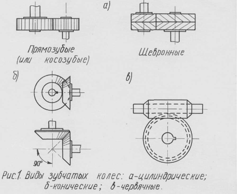 Зубчатые передачи между параллельными валами осуществляются цилиндрическими колесами с прямыми, косыми или шевронными зубьями (рис.1,a).