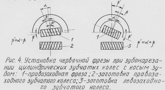 ; если же направление наклона винтовой линии фрез и зубчатого колеса различно (рис.4,б), то угол установки равен сумме углов, т.е.