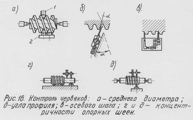 Угол профиля витков проверяется при помощи нормальных угловых шаблонов с базой от наружного диаметра. Для более точных червяков угол профиля проверяется на специальном приборе по схеме, показанной на рис. 16,б. Осевой шаг червяка проверяется на приборе с индикатором (рис. 16,в). Проверка концентричности оси их с осью опорных шеек показана на рис. 16,г,д