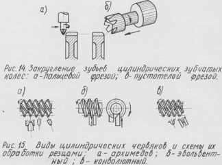 зубчатых колес, предназначенных для коробок передач и других зубчатых колес, переключающихся на ходу, для облегчения включения производится закругление торца зубьев на специальных зубозакругляющих станках при помощи пальцевых фрез методом копирования (рис. 14.а). В процессе работы пальцевая фреза вращается и одновременно перемещается по дуге с возвратно-поступательным движением, огибая кромку зуба обрабатываемого колеса, которая периодически отводится в осевом направлении, поворачивается вокруг оси на один зуб и подводится к фрезе. Время обработки каждого зуба 1-3 сек. Большая производительность достигается при закруглении зубьев пустотелой фрезой, указанной на рис.14,б